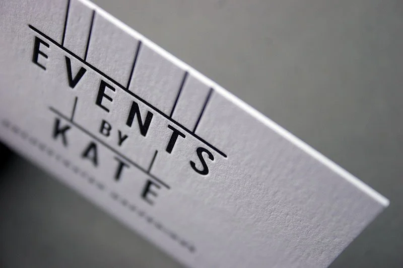 Events by Kate Business Cards 19 Apr Written By Mark Moran Single black letterpress ink on 540gsm Colorplan for Events by Kate. Design by United Creatives. View fullsize View fullsize View fullsize View fullsize View fullsize LetterpressBusiness CardsColorplan Mark Moran